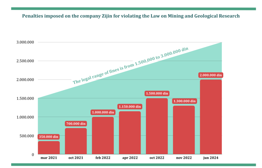 In the previous three years, the company Zijin was sentenced six times for illegal construction – without the necessary permits from the Ministry of Mining and Energy, of which five times it was sentenced below the minimum penalty, while once it was sentenced to the minimum legal penalty. Namely, the legally prescribed penalty for the construction of mining facilities and the execution of mining works without approval is from RSD 1.500.000 to RSD 3.000.000 (aprox. EUR 12.800 to EUR 25.600) whereas the company that was convicted for the seventh time for illegal construction was only fined an amount negligibly higher than the minimum legal penalty.